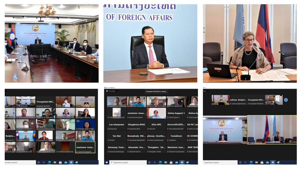 Vientiane, 20 October 2021, the National Sustainable Development Goal (SDG) Secretariat in partnership with the United Nations Resident Coordinator’s Office, jointly organized the virtual ‘Stakeholder Engagement Seminar – Outcomes of the 2nd Voluntary National Review and Pre-Consultation for the 13th High-Level Round Table Meeting’. The meeting was chaired by H.E Mr. Phoxay KHAYKHAMPHITHOUNE, Deputy-Minister of Foreign Affairs, and co-chaired by Ms. Sara Sekkenes, United Nations Resident Coordinator to the Lao PDR. The seminar was attended by more than 150 participants from the Government sectors, namely the National SDG focal points from line ministries and ministry-equivalent organizations; the UN agencies, civil society organizations, international non-governmental organizations, private sector and other relevant sectors.